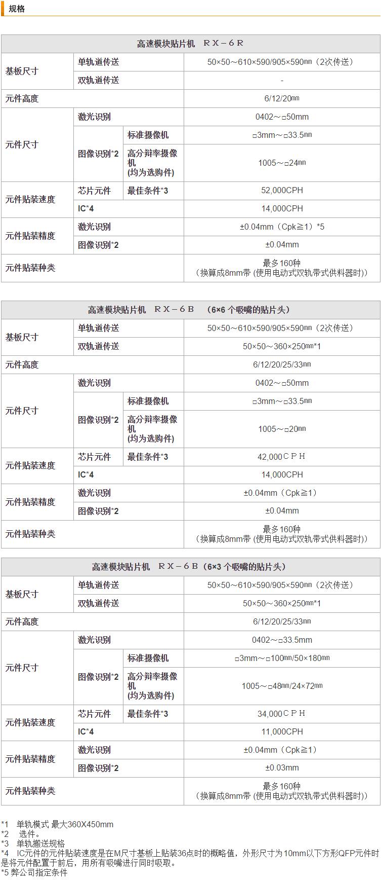 RX-6R是投入在RX-6系列中的新機型,由于改善了吸嘴上下移動的軸、增加了強度、優化了貼裝頭的高度等,使貼裝速度與以往機相比大幅度地提高了24%,達到52,000CPH(最佳條件)。