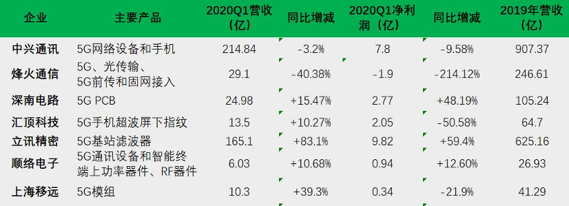 5G商用開始后,受益于5G基站建設開啟,深南電路、立訊精密、順絡電子在2020年第一季度營收持續增長,但是受到疫情影響,中興通信和烽火通信在2020年第一季度營收和利潤出現下滑,5G應用落地加速,通信模組制造商上海移遠在2020年第一季度實現營收增長。