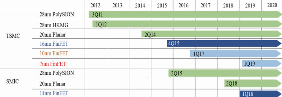 上圖為中芯國(guó)際與臺(tái)積電制程工藝時(shí)間差距